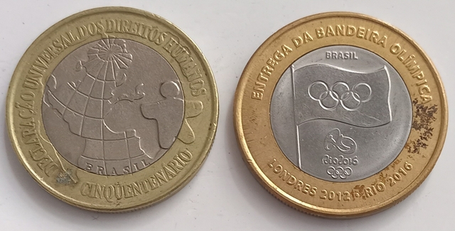O terceiro exemplo é uma moeda mais recente, mas igualmente desejada: a de 2012, criada em comemoração à entrega da bandeira olímpica ao Brasil, em preparação para os Jogos Olímpicos de 2016, realizados no Rio de Janeiro.