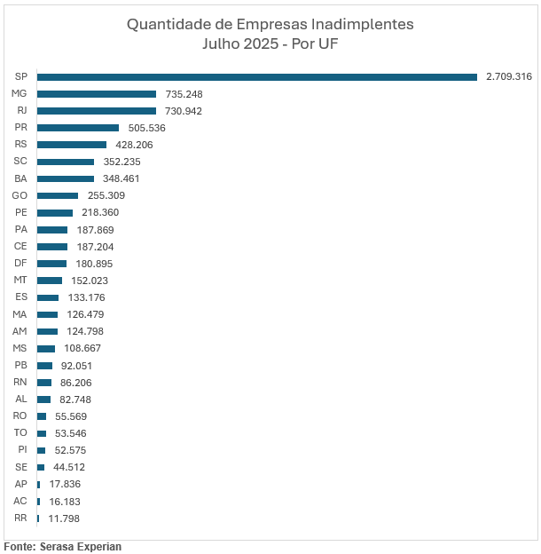 De acordo com o Indicador de Inadimplência das Empresas, elaborado pela Serasa Experian, o país registrou 8 milhões de CNPJs inadimplentes em julho de 2025, o maior número já observado desde o início da série histórica.