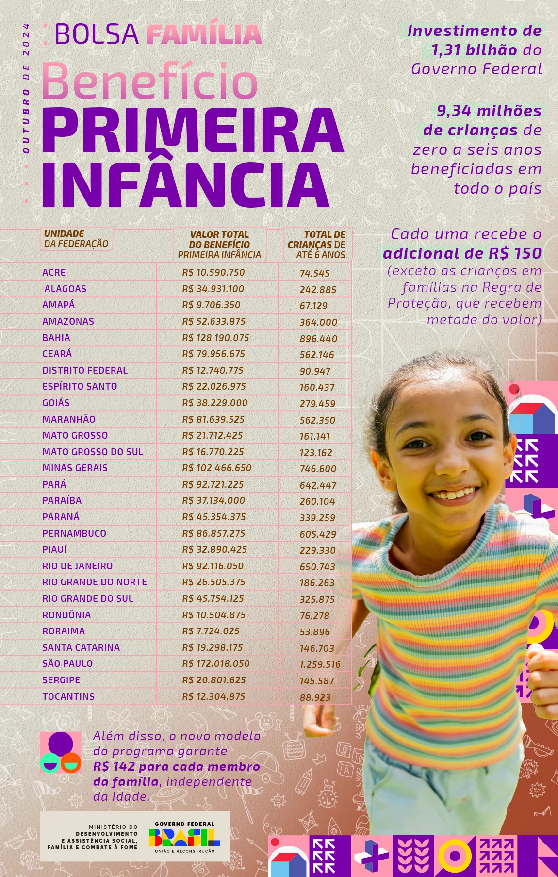 Esses grupos recebem adicionais de R$ 150 (crianças de 0 a 6 anos) ou R$ 50 (7 a 18 anos incompletos). Gestantes e nutrizes também ganham R$ 50. Em outubro, serão pagos 9,34 milhões de Benefícios Primeira Infância (BPI), totalizando R$ 1,31 bilhão.
