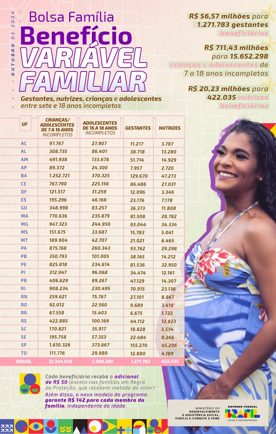 O PBF repassa ainda 1,27 milhão de Benefícios Variáveis Familiares para gestantes, somando R$ 59,57 milhões, e 422,03 mil para nutrizes, no valor de R$ 20,23 milhões.