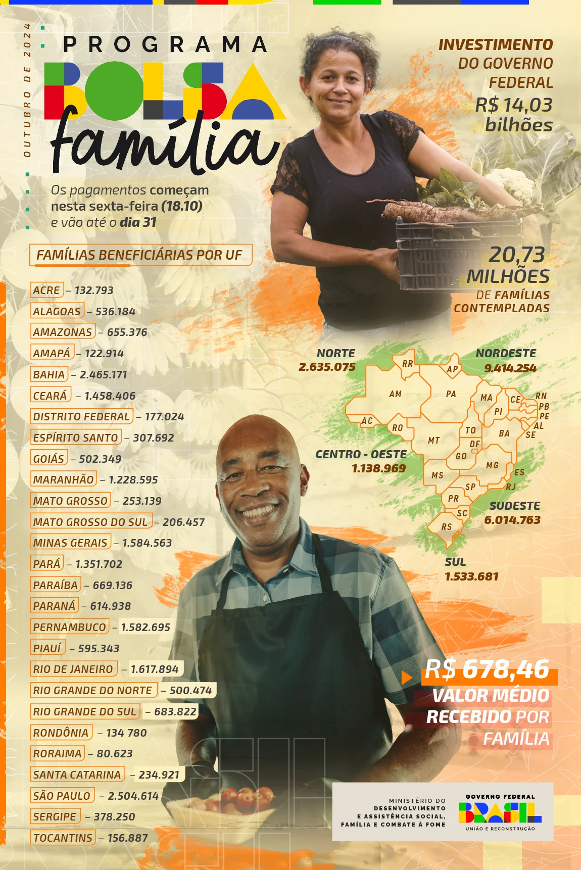 O Bolsa Família vai incluir 400 mil novas famílias em outubro, com foco em lares com crianças, adolescentes e grupos vulneráveis, como indígenas e pessoas em situação de rua. No total, 20,73 milhões de famílias receberão os recursos a partir desta sexta-feira (18.10). O MDS investirá R$ 14,03 bilhões, com benefício médio de R$ 678,46.