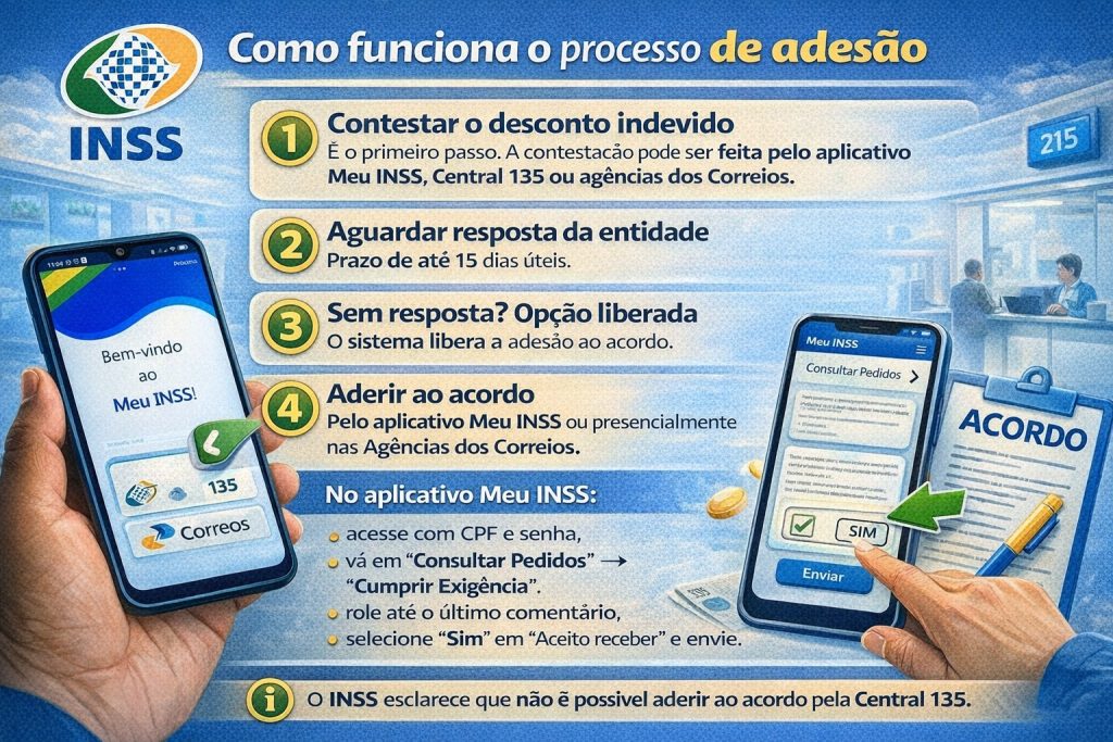 A adesão ao acordo pode ser feita pelo aplicativo Meu INSS ou presencialmente nas agências dos Correios. No entanto, o INSS informa que esse procedimento não pode ser realizado pela Central 135, que funciona apenas para consultas e orientações.