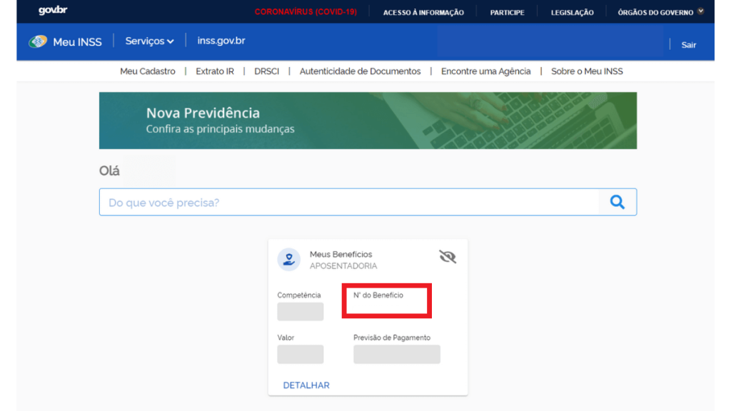Na tela inicial, aparecerá o nome do benefício e o número correspondente.