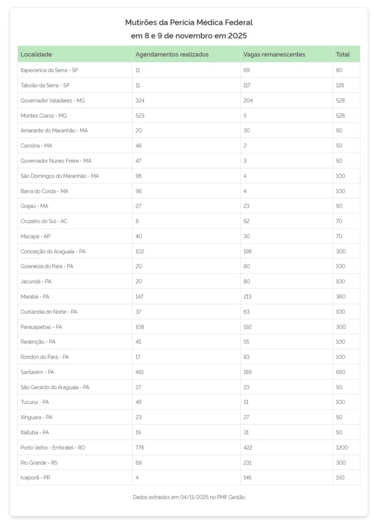 O Ministério da Previdência Social, por meio da Perícia Médica Federal, realiza neste fim de semana, dias 8 e 9 de novembro, um mutirão de perícias médicas em várias cidades do país. A ação visa reduzir o tempo de espera e agilizar a concessão de benefícios do INSS.