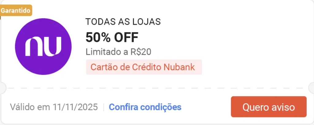Combinação com outros cupons: A Shopee informará se o desconto do Nubank pode ser acumulado com outros cupons, como o de frete grátis.