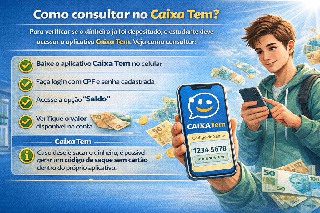 Para verificar se o dinheiro já foi depositado, o estudante deve acessar o aplicativo Caixa Tem. Veja como consultar: